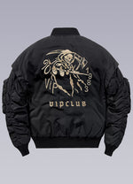 The Bomber Jacket Skull's design is striking and fearless, its imposing black skull inspiring awe and trepidation in those who dare cross your path. Every detail of this masterpiece exudes power and prestige, from the glossy black matte skull buttons to the stylish vintage 'Ace of Spades' patch adorning the right sleeve. Dominating the back is a magnificent gold reaper design, accompanied by the bold VIP CLUB inscription, affirming your unwavering strength and audacity.