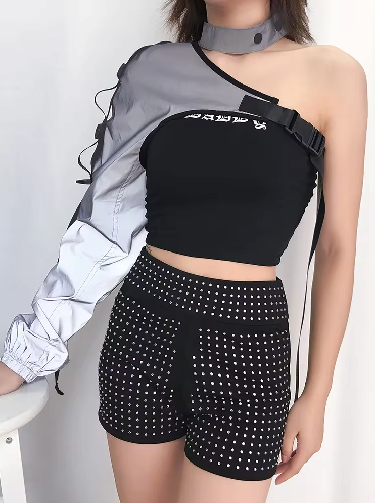 We present a chic and powerful techwear one-sleeve top in a world where fashion and technology merge. Its striking design emanates strength and sensuality, setting a new standard for urban attire. The sophisticated choker collar, a bold choice tailored for women, adds an extra layer of allure, ensuring you feel and embody power, confidence, and style.