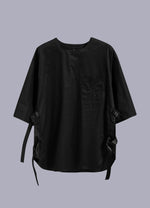 Adding texture, sophistication, and a tactcal element to this ostensibly blank canvas are black straps and buckles attached to the hips, and a reinforced section on the back, contributing to the techwear aesthetic. With its interplay of simplicity and complexity, this shirt effortlessly transforms into an intimidating yet irresistible techwear ninja outfit.