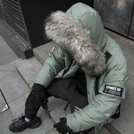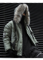 This parka effortlessly merges the aesthetics of a futuristic jacket and a techwear winter jacket, resulting in a unique and striking garment. The military-inspired green hue is accentuated by the large hood lined with faux fur, providing warmth and an unmistakable air of sophistication. The two long black straps with buckles at the shoulders lend a tactical edge to this techwear long coat, making it more than just a piece of clothing - it's a statement.